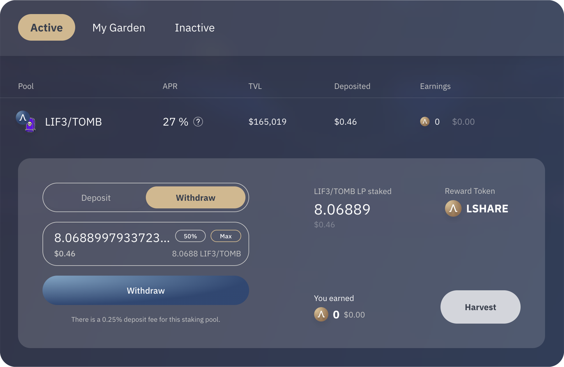 1. Choose the farm you want to withdraw from, select the amount of LPs you want to withdraw, and confirm the tx